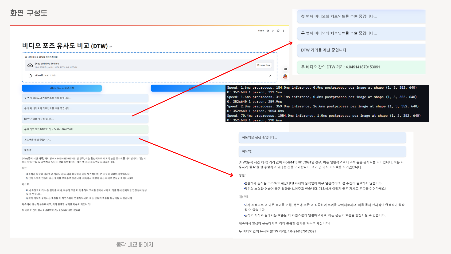 YOLOv8모델과 DTW알고리즘을 통해 계산된 동작 유사도 결과를 통해 AI 피드백 생성을 진행하여